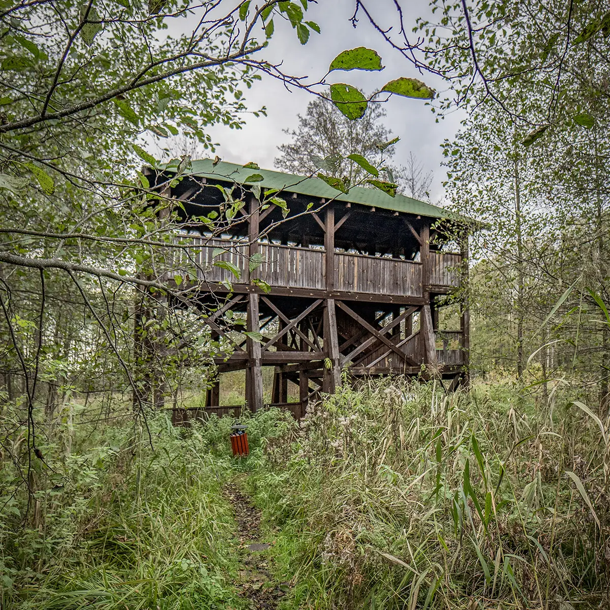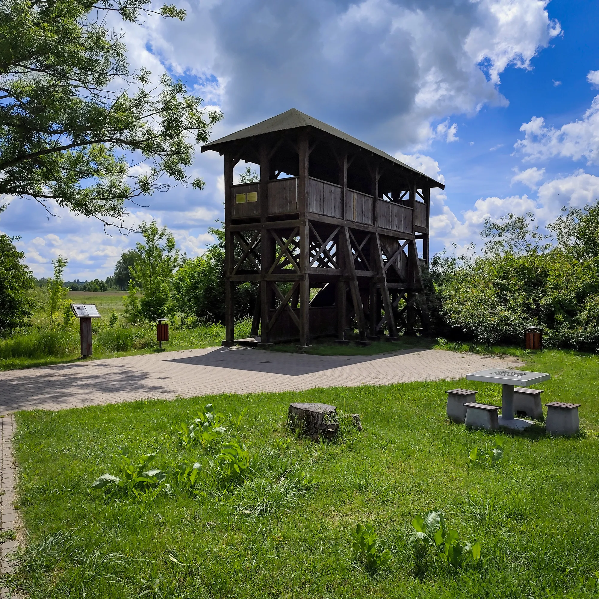 Imponujących rozmiarów wieża widokowa z pięknym widokiem na polanę i rozlewiska rzeki Narewka.