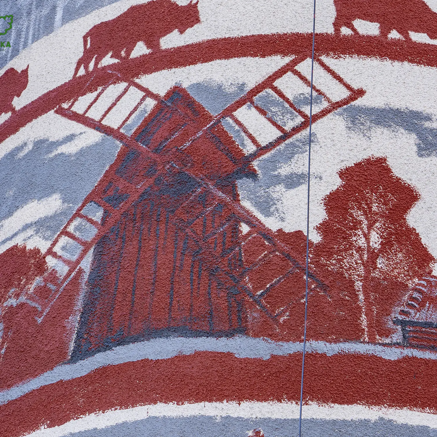 🔹 Drugi mural powstał na półokrągłej, południowej ścianie muzeum, zwanej „wieżą”. Nawiązywał do ręcznika obrzędowego i przedstawiał wiejski krajobraz z polami, gospodarzem orzącym ziemię oraz wierzby.