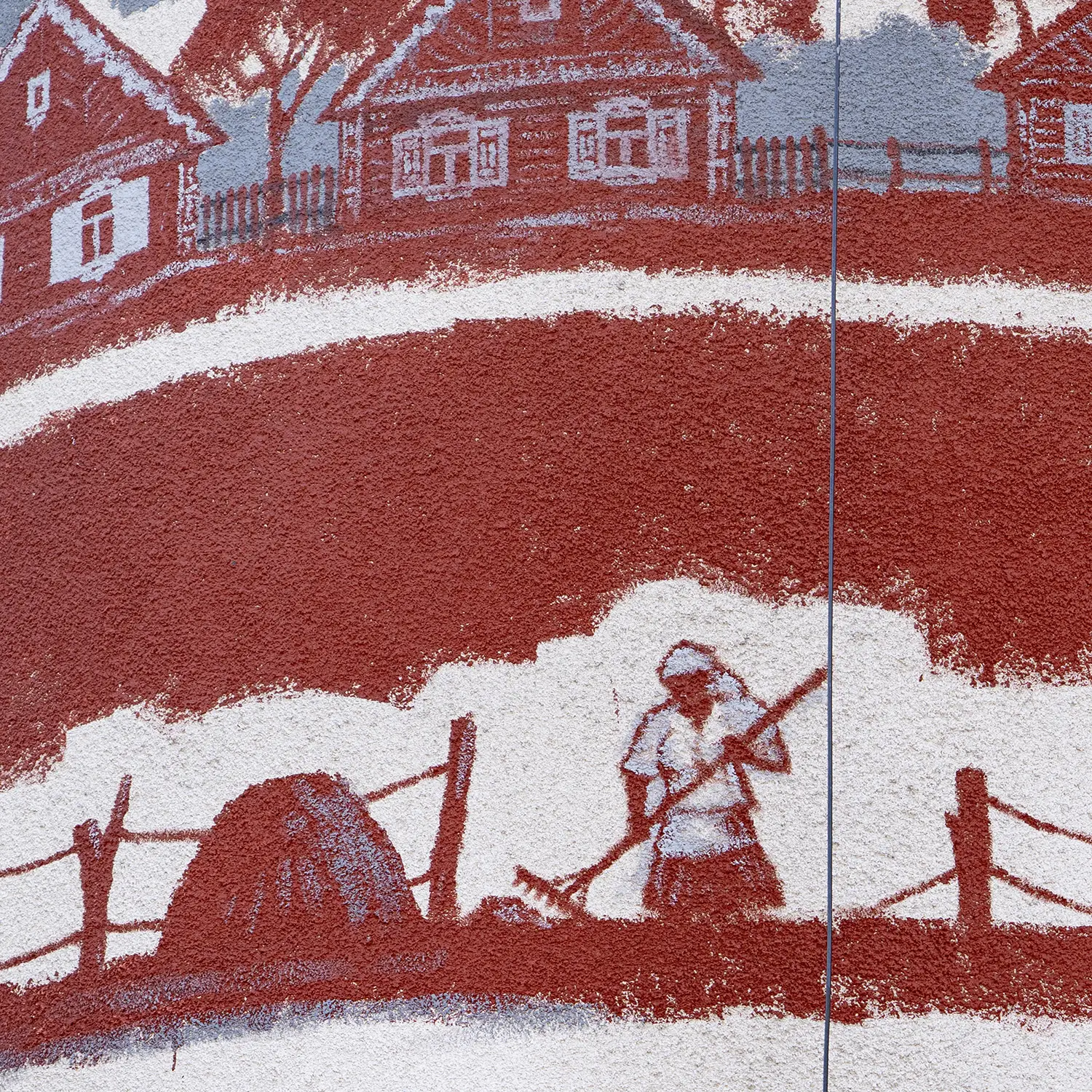 🔹 Ten mural ukazuje dawną wieś podlaską, pracę jej mieszkańców i ściśle nawiązuje do etnograficznego charakteru muzeum i zgromadzonych eksponatów.