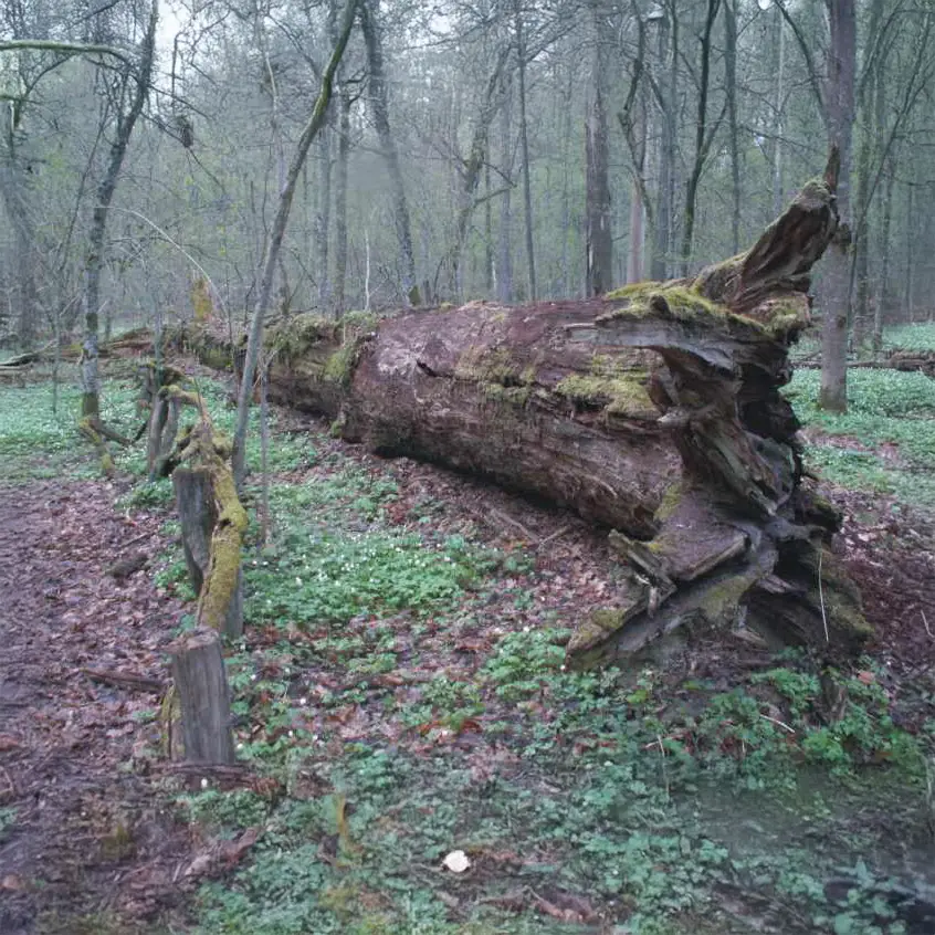 🔹 Obecnie można oglądać rozkładający się pień dębu w Białowieskim Parku Narodowym