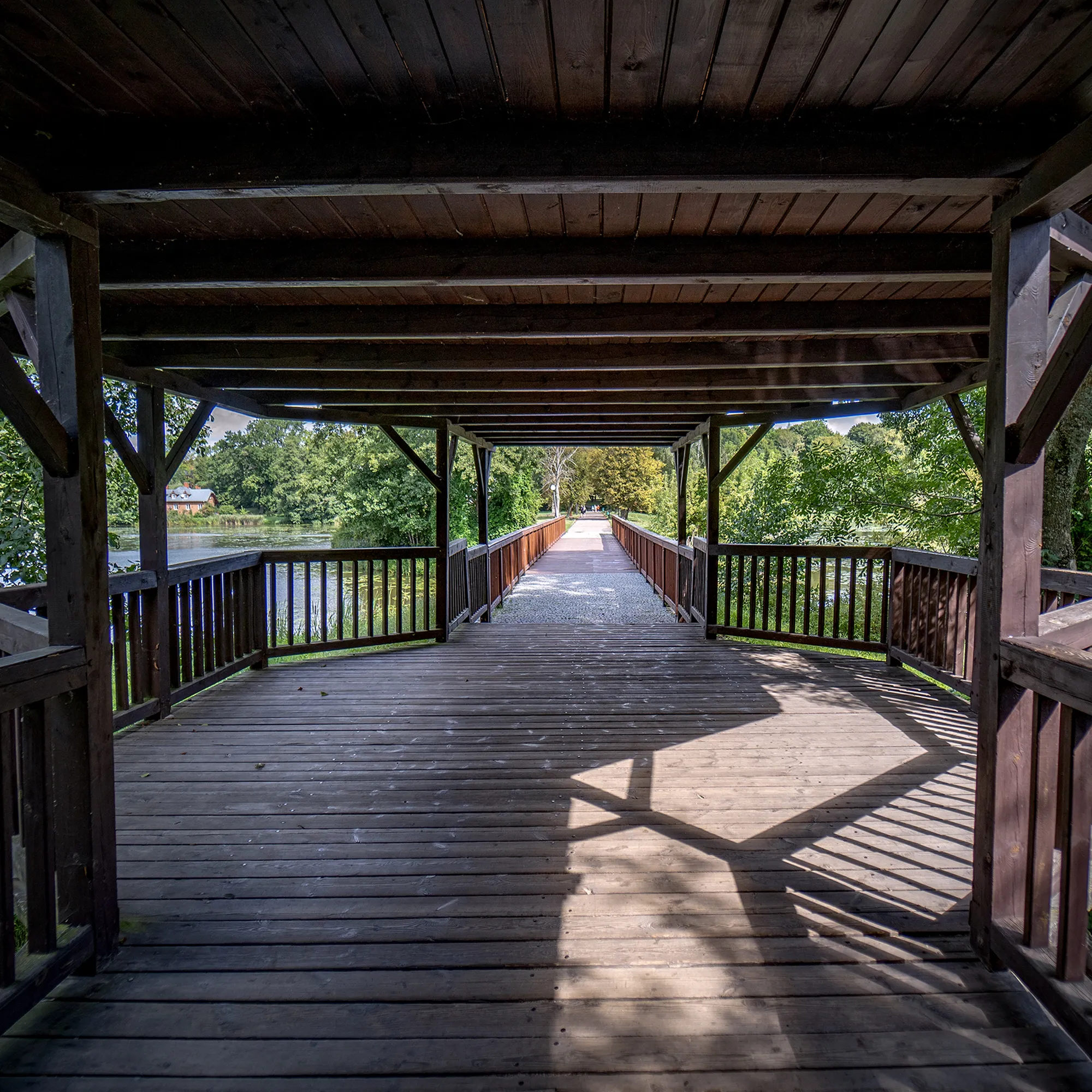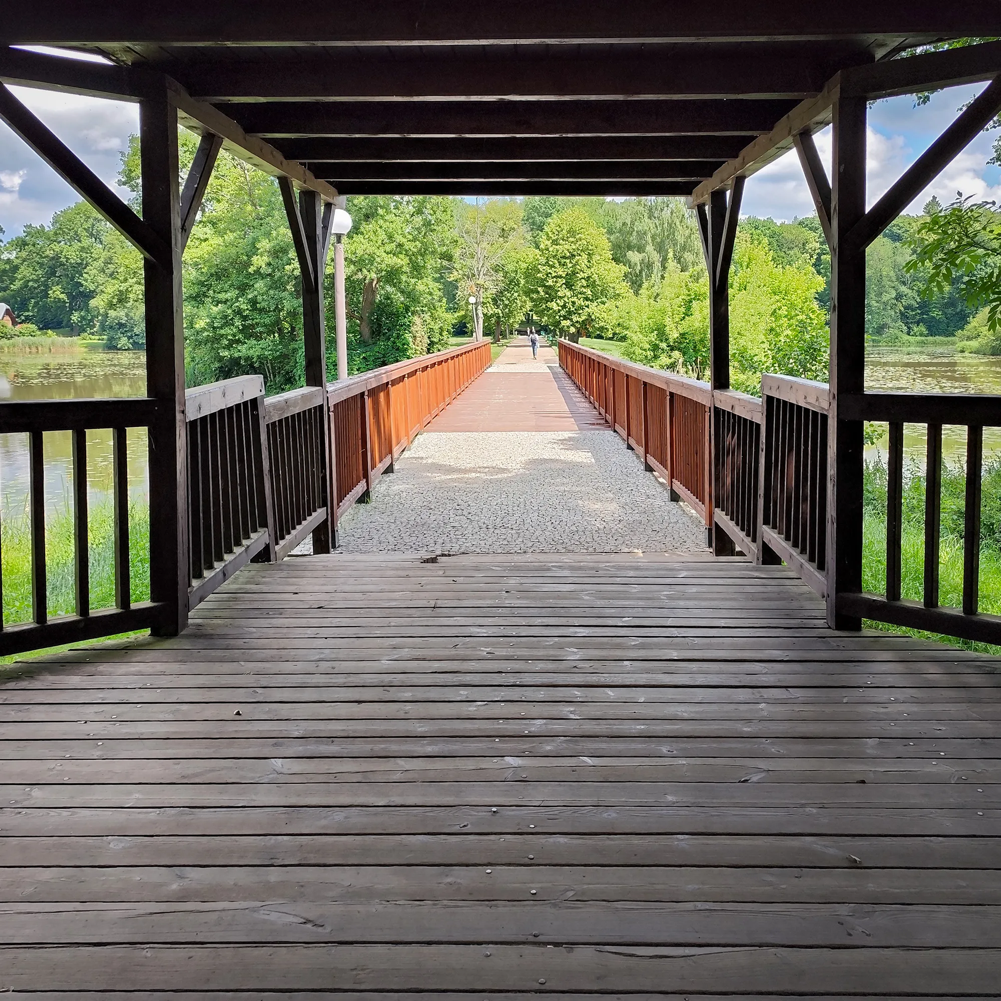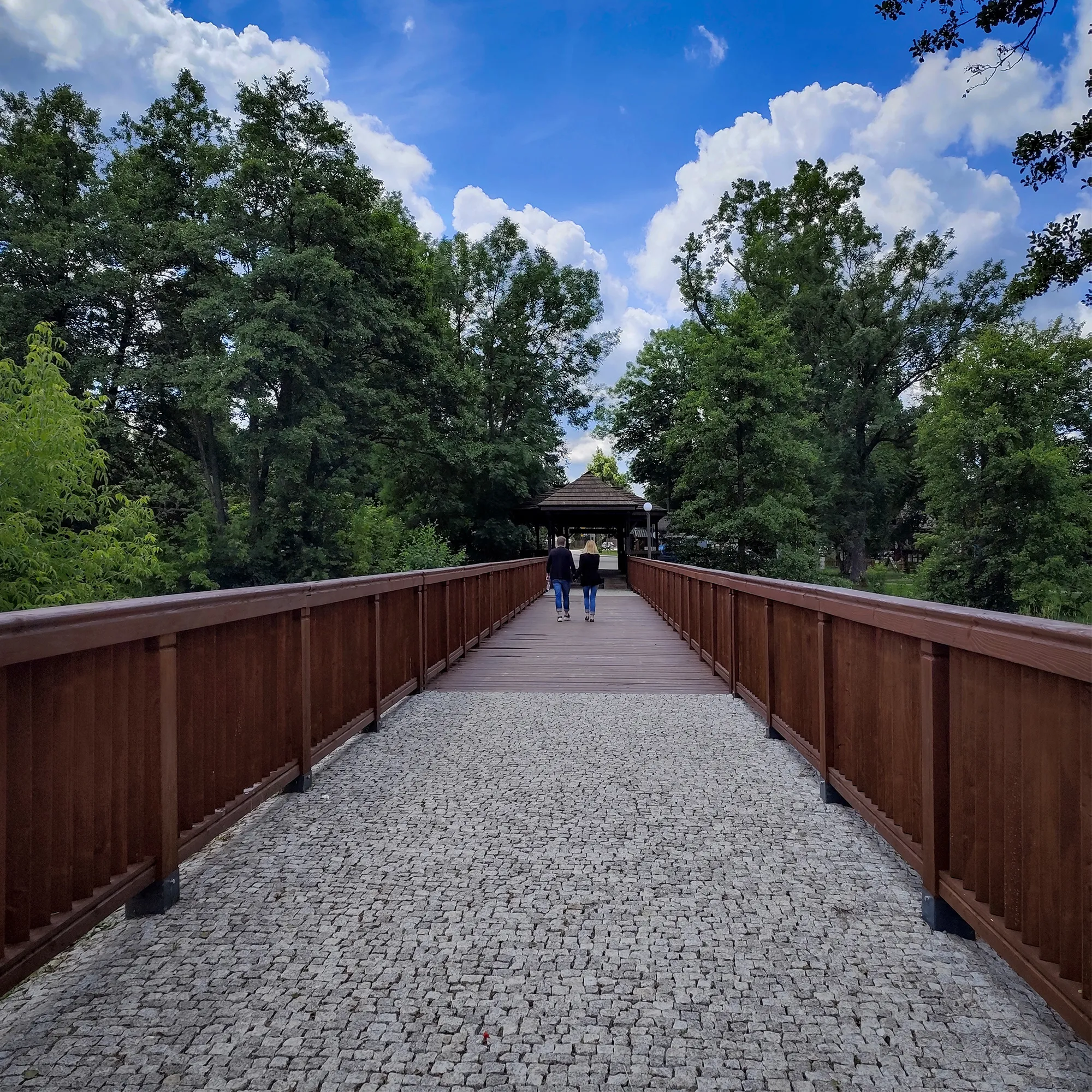 W 1975 roku zbudowano pierwszą część drewnianego mostku, a w 1978 roku ukończono drugą. Aby ułatwić przejście, w 1978 roku wykonano również asfaltową nawierzchnię na grobli. Po około 20 latach mostek wymagał remontu, który przeprowadziła firma Hydroinż jesienią 1999 roku. Słupy mostku zostały wzmocnione i podniesione nad poziom wody, aby zapobiec korozji. Ponowny kapitalny remont mostek przeszedł w okresie od września do grudnia 2010 roku.