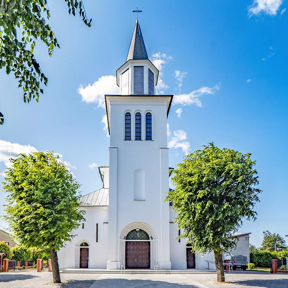 🔹 Kościół znajduje się w centrum Hajnówki, przy ulicy 3 Maja