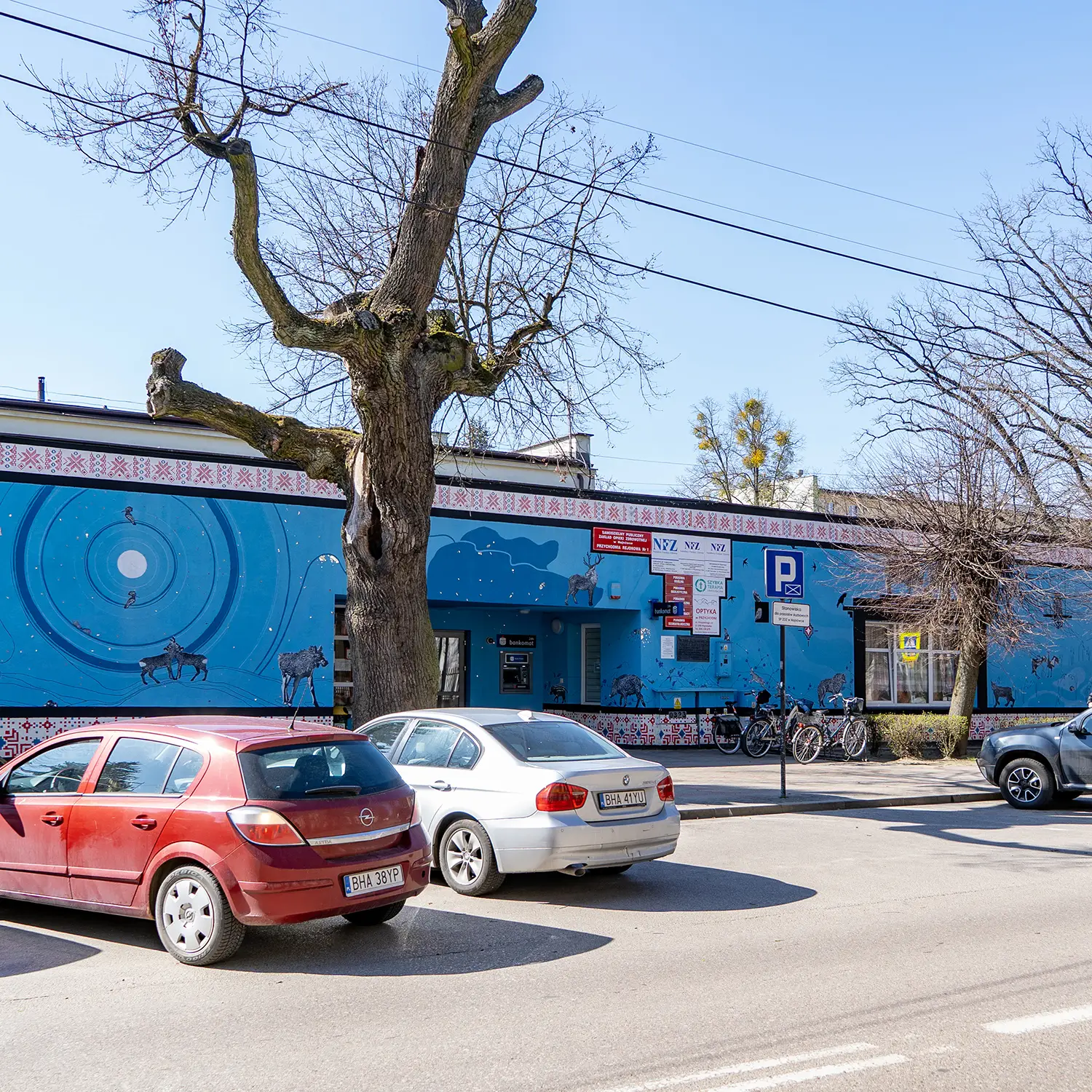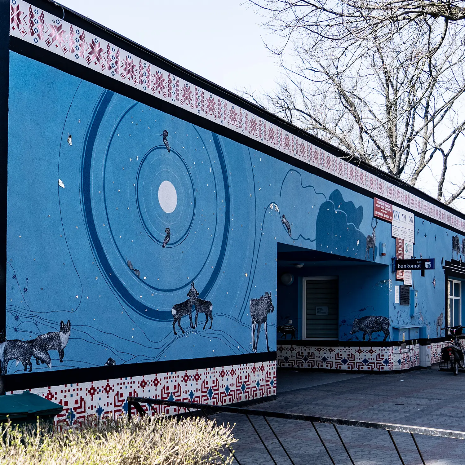 Na ścianie budynku pojawiły się zwierzęta i ptaki typowe dla Puszczy Białowieskiej – te same, które mieszkańcy wskazali podczas warsztatów jako najbardziej charakterystyczne i bliskie ich sercu. Wspólnie decydowano o doborze gatunków i skali przedstawień. Inspiracją dla części graficznych były lokalne wzory ludowe, zaczerpnięte z pamiątkowych obrusów i narzut – codziennych przedmiotów, które stały się źródłem unikalnego wzornictwa.
