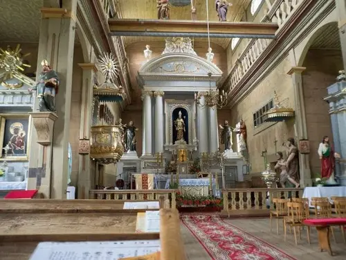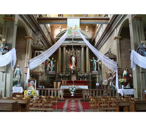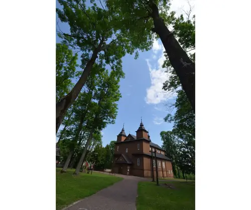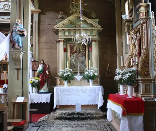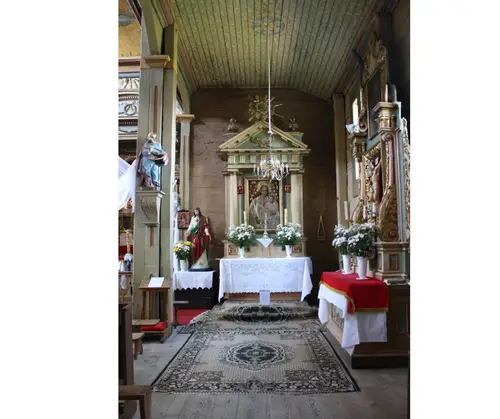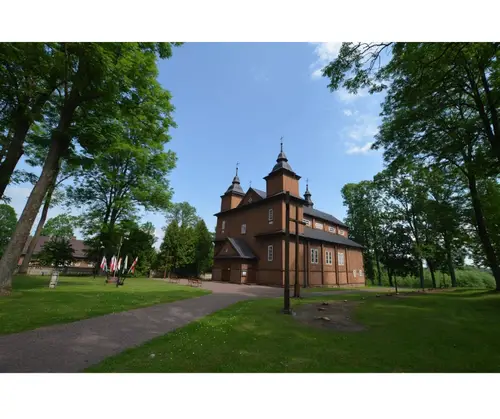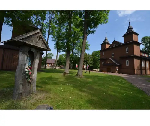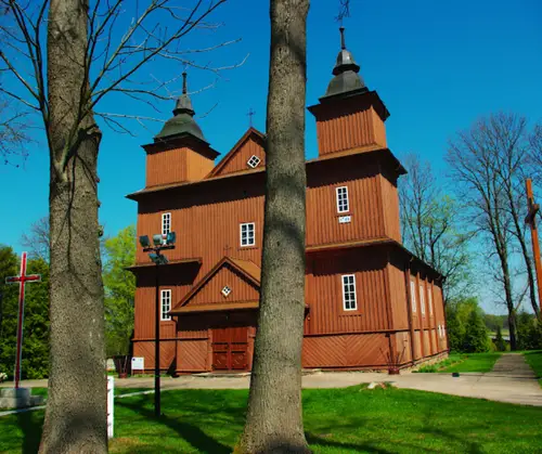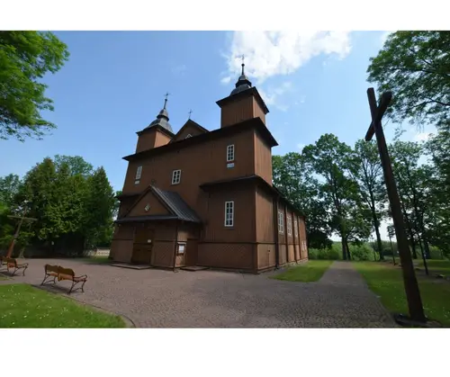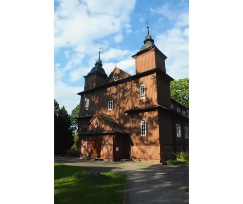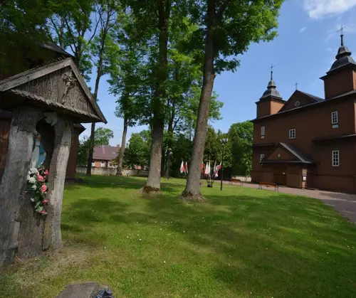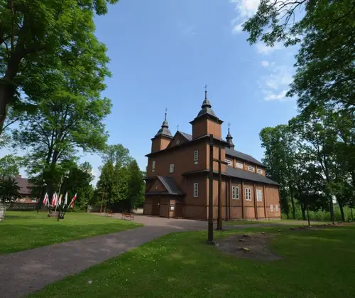 Sercem parafii jest drewniany kościół, wzniesiony w latach 1738–1748, uznawany za jedną z najpiękniejszych perełek barokowej architektury sakralnej w Polsce. Jego dwuwieżowa sylwetka, misternie rzeźbione detale i ciepły odcień brązowego drewna przyciągają wzrok każdego podróżnika. Wejdź do środka, a odkryjesz unikatowe barokowe wyposażenie – od renesansowego ołtarza z figurą św. Stanisława po rzadko spotykane ławy z wysuwanymi mini-ławkami, które są prawdziwym architektonicznym smaczkiem. Nie przegap też dwóch XVI-wiecznych obrazów Ukrzyżowania malowanych na desce oraz XVII-wiecznego wizerunku Matki Boskiej Hodigitri – to relikty przeszłości, które przetrwały stulecia.