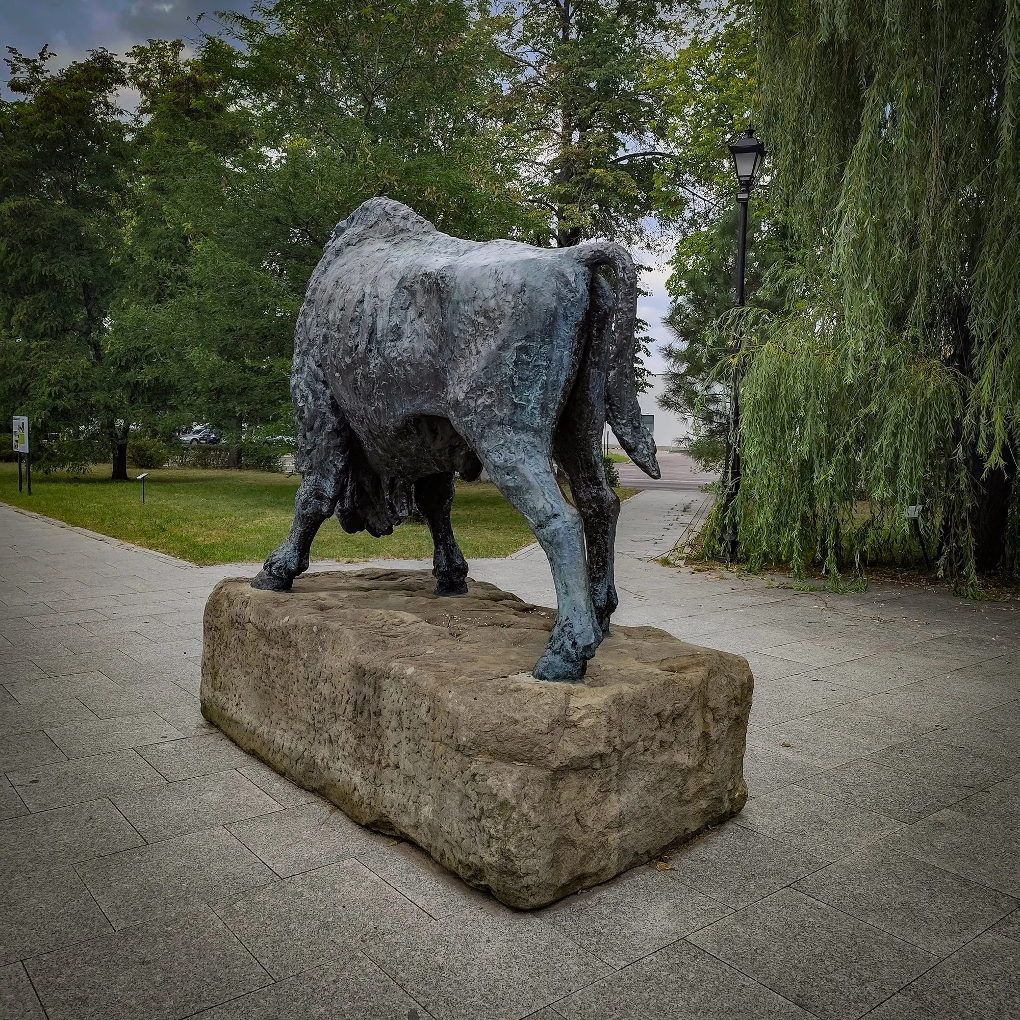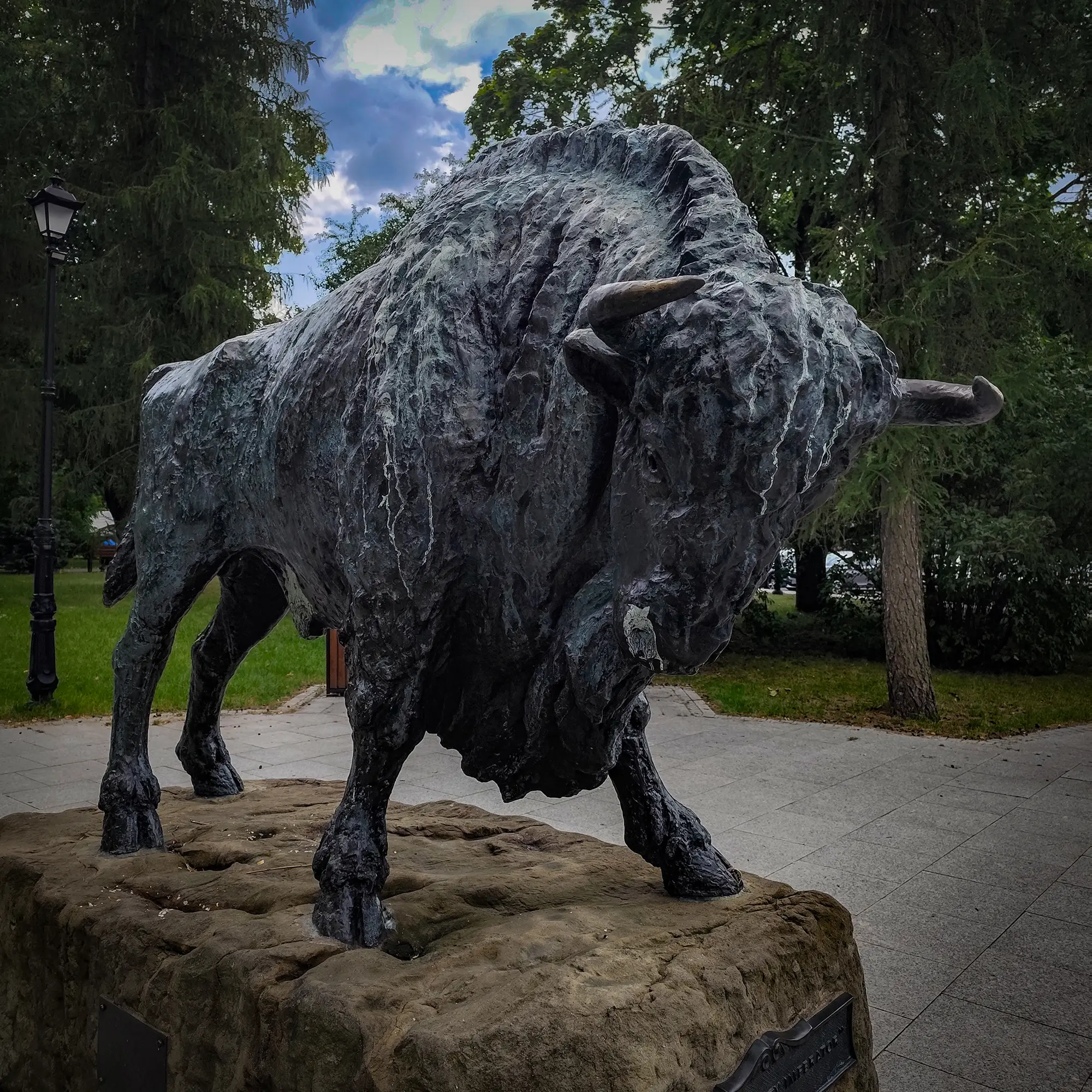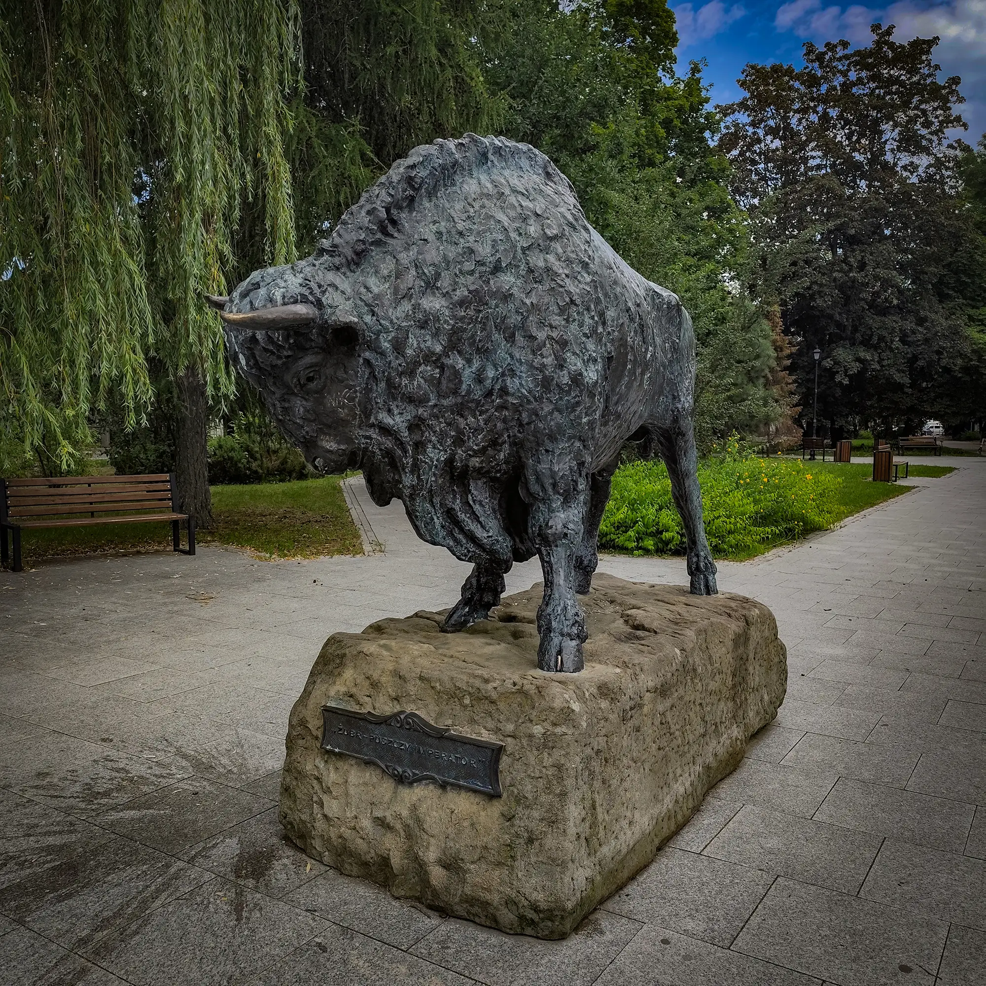 Pomnik Żubra to potężna, realistyczna rzeźba przedstawiająca żubra stojącego na kamiennym cokole. Figura wykonana jest z brązu, co nadaje jej majestatyczny wygląd. Żubr, przedstawiony w naturalnej wielkości, z dumą spogląda w dal, symbolizując siłę i niezłomność przyrody. Cokół pomnika, wykonany z kamienia, jest ozdobiony tablicą pamiątkową z dedykacją upamiętniającą znaczenie żubra dla Puszczy Białowieskiej oraz ochrony przyrody w Polsce.