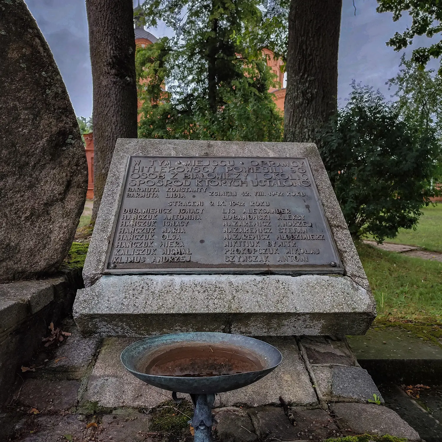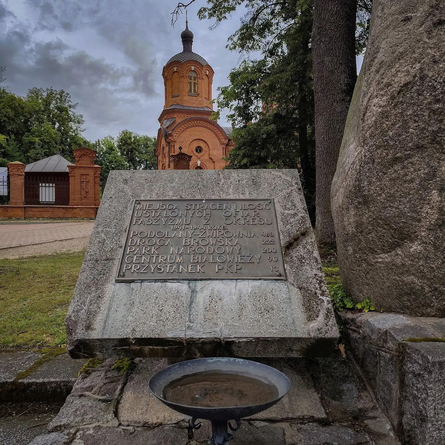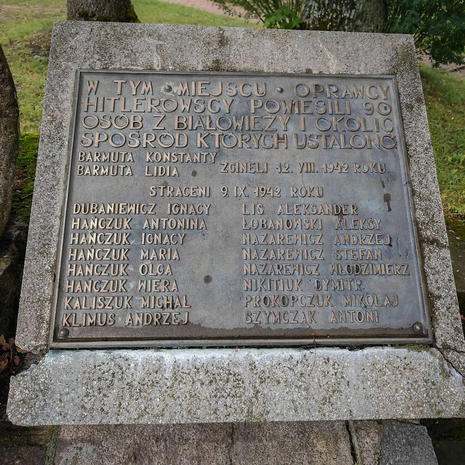Pomnik ten upamiętnia miejsce publicznych, masowych egzekucji, dokonywanych przez hitlerowców w okresie od sierpnia 1942 roku do listopada 1943 roku. Swoje ofiary wieszali oni na drzewach rosnących na placu przed cerkwią. Pomnik wystawiony został w 1959 roku. Środki na jego budowę zgromadzone zostały z datków mieszkańców Białowieży oraz powiatu hajnowskiego, bielskiego i białostockiego, a także rejonu prużańskiego na Białorusi, skąd pochodziły stracone osoby.