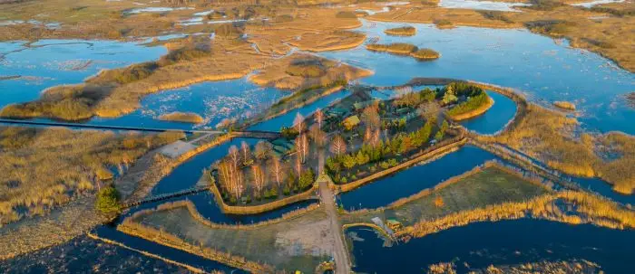 🔹 Do Skitu prowadzi malownicza, 800-metrowa drewniana kładka wijąca się nad torfowiskami – symboliczne przejście do świata sacrum.