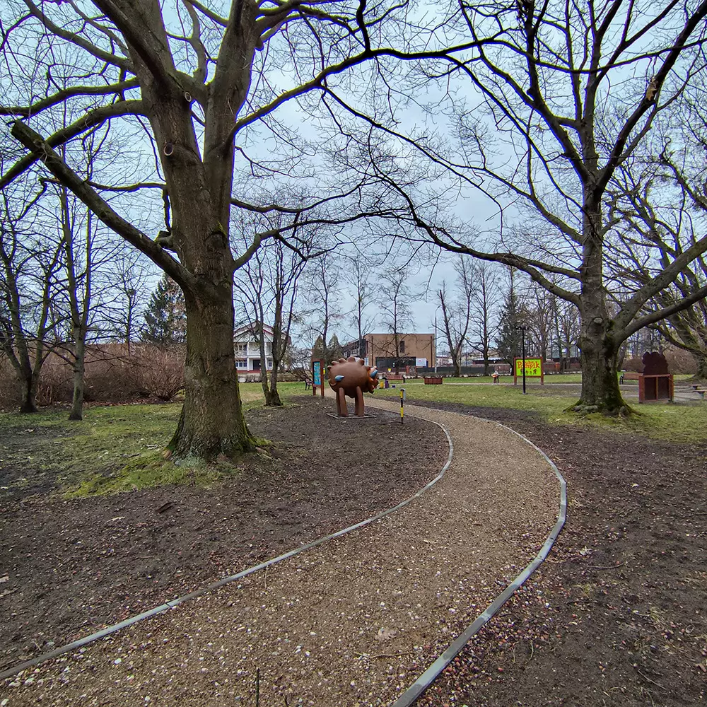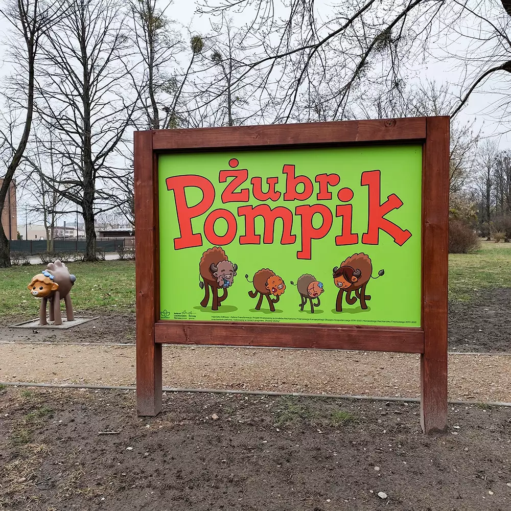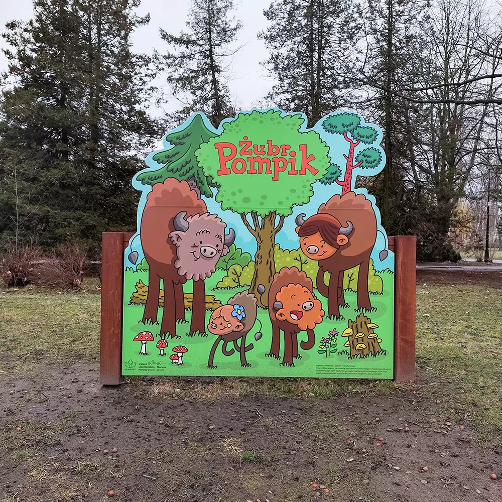 🔹 Wzdłuż alejki ustawione są tablice informacyjne na temat żubrów i książek o Pompiku autorstwa Tomasza Samojlika